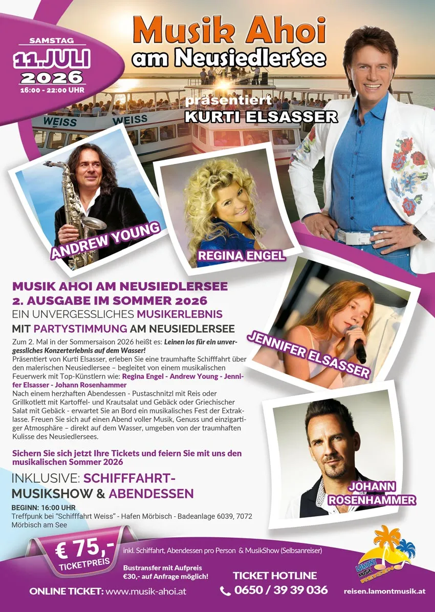 Zum 2. Mal in der Sommersaison 2026 heißt es: Leinen los für ein unvergessliches Konzerterlebnis auf dem Wasser! Präsentiert von Kurti Elsasser, erleben Sie eine traumhafte Schifffahrt über den malerischen Neusiedlersee – begleitet von einem musikalischen Feuerwerk mit Top-Künstlern wie: Regina Engel – Andrew Young – Jennifer Elsasser – Johann Rosenhammer
